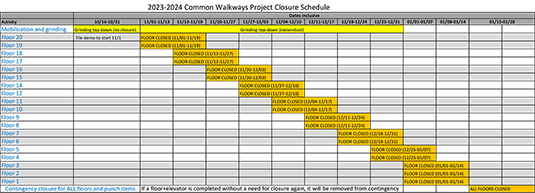 Every floor will be completely closed for 2 weeks in line with the below schedule and all floors will be tentatively closed between 01/15/2024 to 01/28/2024 as a contingency. If a floor is completed without a need to close again, it will be removed from contingency and we will inform you.