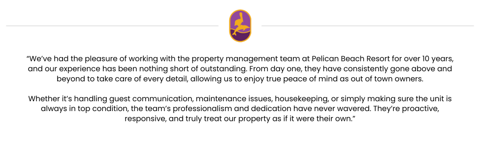Experience a new standard of excellence in vacation rental property management with Pelican Beach Management. For more than 25 years, we have been dedicated to delivering unparalleled service to property owners at the exquisite Resorts of Pelican Beach in beautiful Destin, Florida. Our unwavering commitment to innovation, integrity, and excellence sets us apart in the industry. By seamlessly blending the personalized care and expertise of a local property manager with the vast resources and cutting-edge marketing strategies of a national company, we offer you the best of both worlds. Entrust your investment to us and enjoy peace of mind as we elevate your property's potential to new heights.
