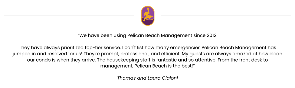 From reservation inquiries to secure online bookings, repair calls, and housekeeping, Pelican Beach Management takes care of every aspect of the guest experience. We handle it all so that you can focus on what matters most to you. Our team is well-versed in providing outstanding customer service, ensuring hassle-free vacations for your guests and peace of mind for you as a property owner.